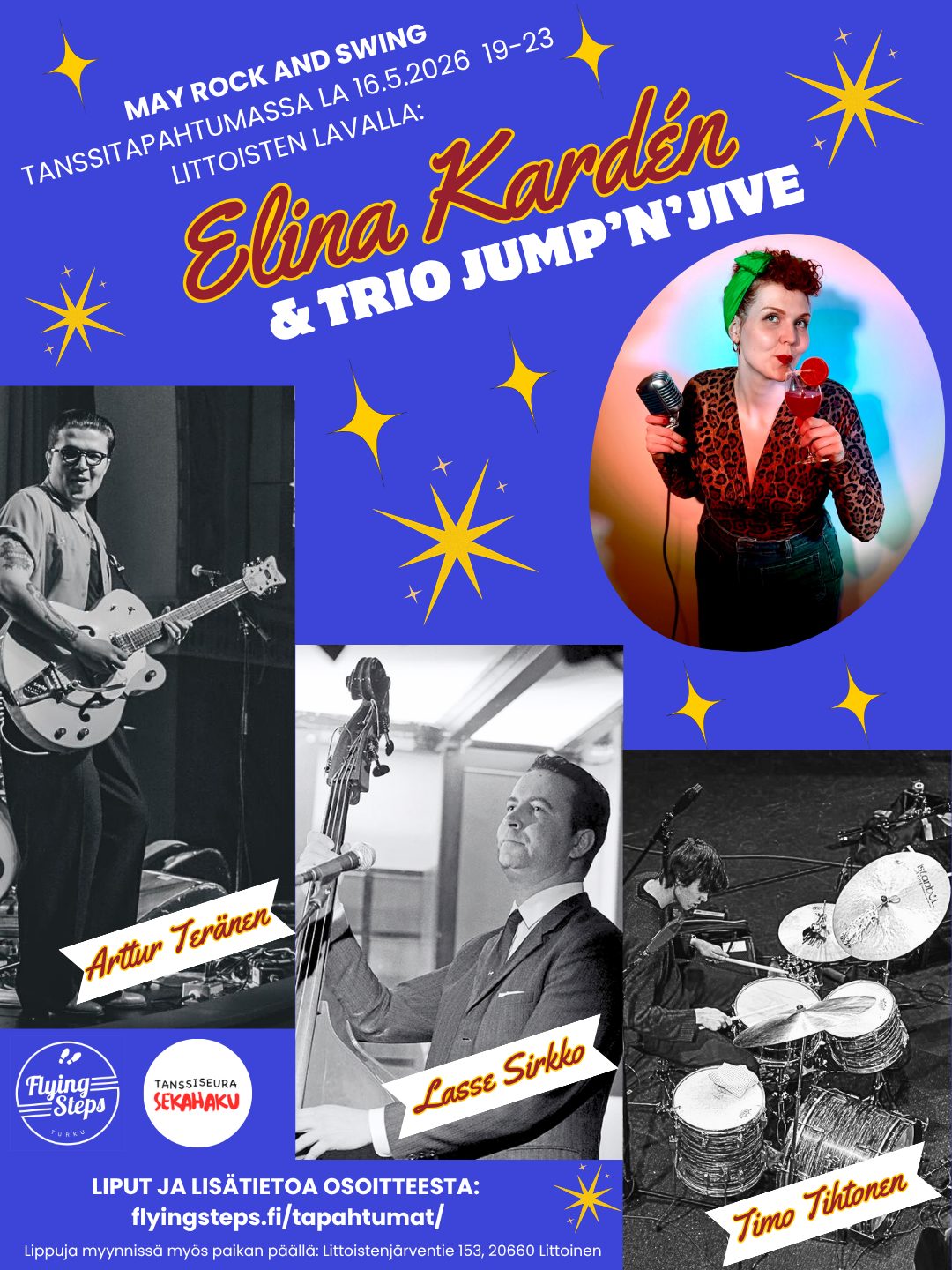 16.5.2026 May Rock'n'Swing tanssifestivaali: Elina Kardén & Trio Jump'n'Jive (Arttur Teränen - kitara, Lasse Sirkko - kontrabasso & Timo Tihtonen - rummut), klo 19-23, Littoisten tanssilava (Littoistenjärventie 153, 20660 Turku) Liput ja lisätietoa